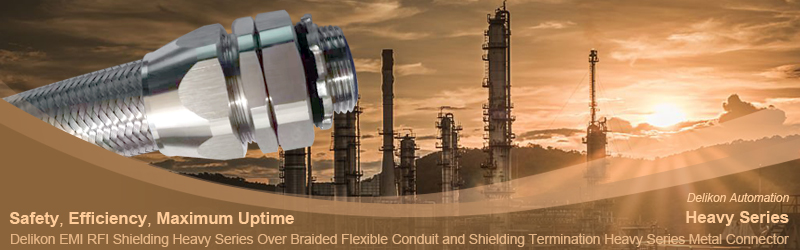 the braiding tightly.Delikon EMI RFI Shielding Heavy Series Over Braided Flexible Conduit and 360 degrees EMI RFI shield termination Heavy Series Connector shield control and data cables against electromagnetic interference EMI, ensuring reliable control and data transfer. Delikon VFD cables Heavy Series Over Braided Flexible Conduit System |